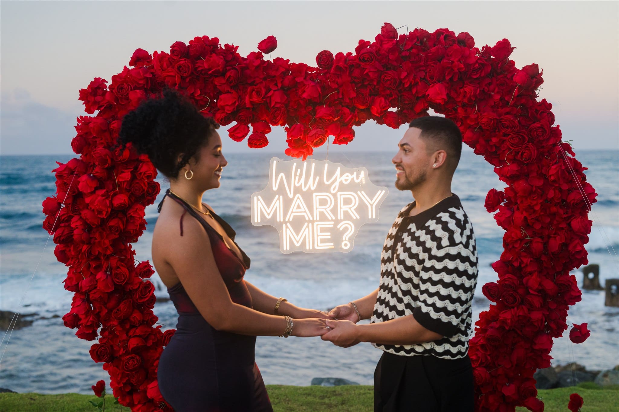 The decor team had already transformed the oceanfront lawn. A full red rose heart arch, larger than life, anchored to the grass. Cascading blooms. Tall crystal candle pillars catching the late afternoon light. A "Will You Marry Me?" sign glowing softly at the center of the arch.